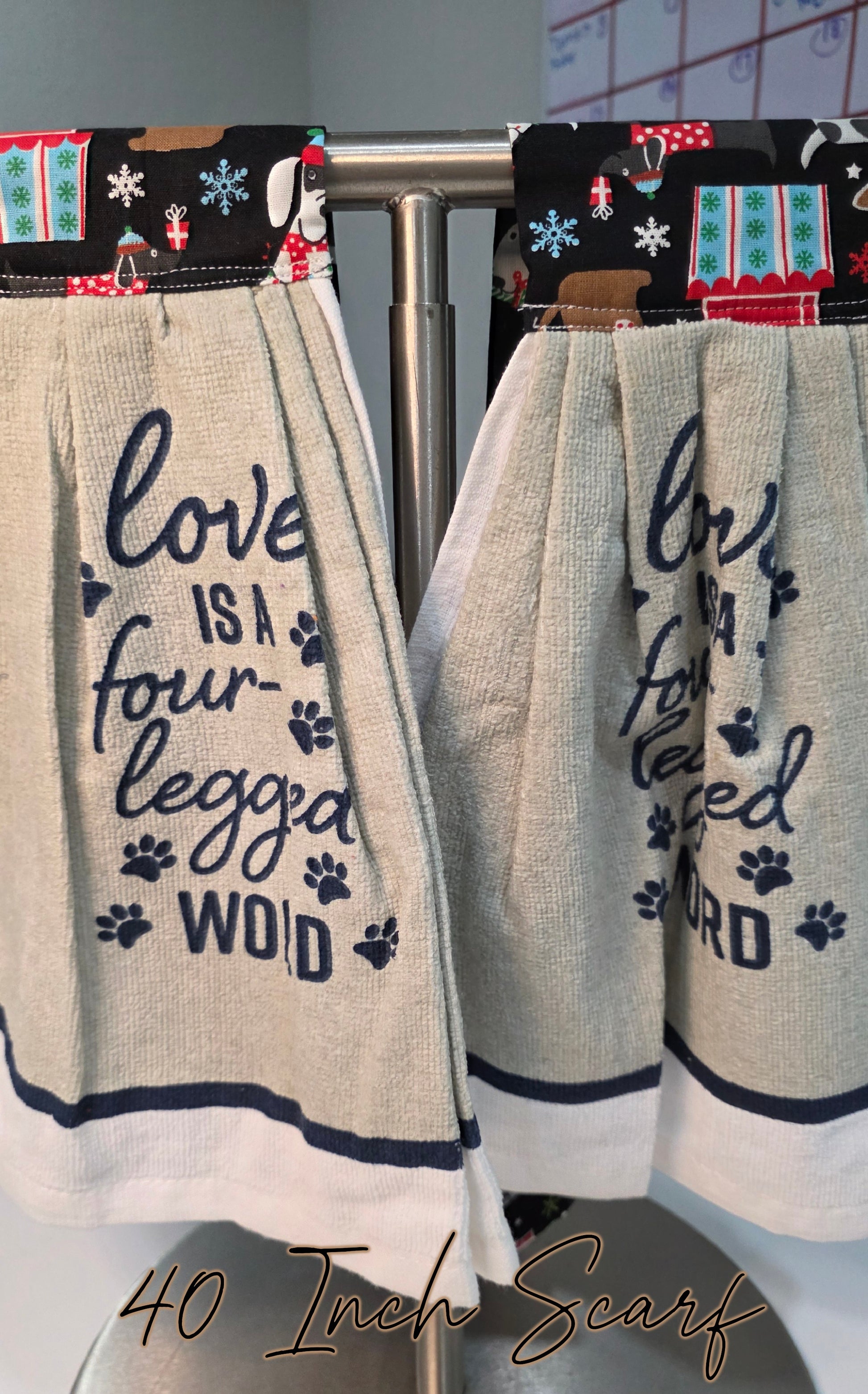 All kitchen towels are handmade by me. When deciding on the length, measure around your neck and down your torso to where you want the towel to begin. The towel's length is not included in the scarf's length.